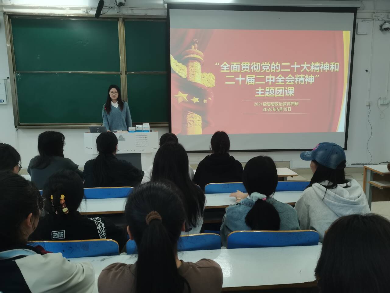 为深入贯彻学习党的二十大精神,4月19日下午,sjb世俱杯网站2021级思想政治教育四班在社科楼514教室开展“全面贯彻党的二十大精神和二十届二中全会精神”主题团课。2021级思想政治教育四班全体团员参加本次团课。团课由团支书刘珂含主持。