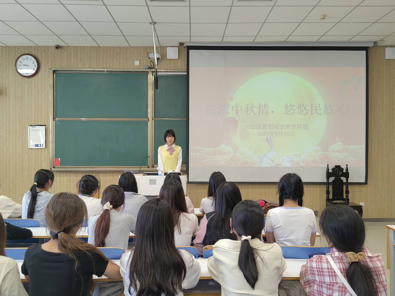 9月18日上午,sjb世俱杯网站2022级思想政治教育四班在社科楼515教室组织召开“浓浓中秋情,悠悠民族心”主题班会。世俱杯官网2022级思想政治教育四班全体成员参与本次班会。本次班会由文艺委员周可盈主持。