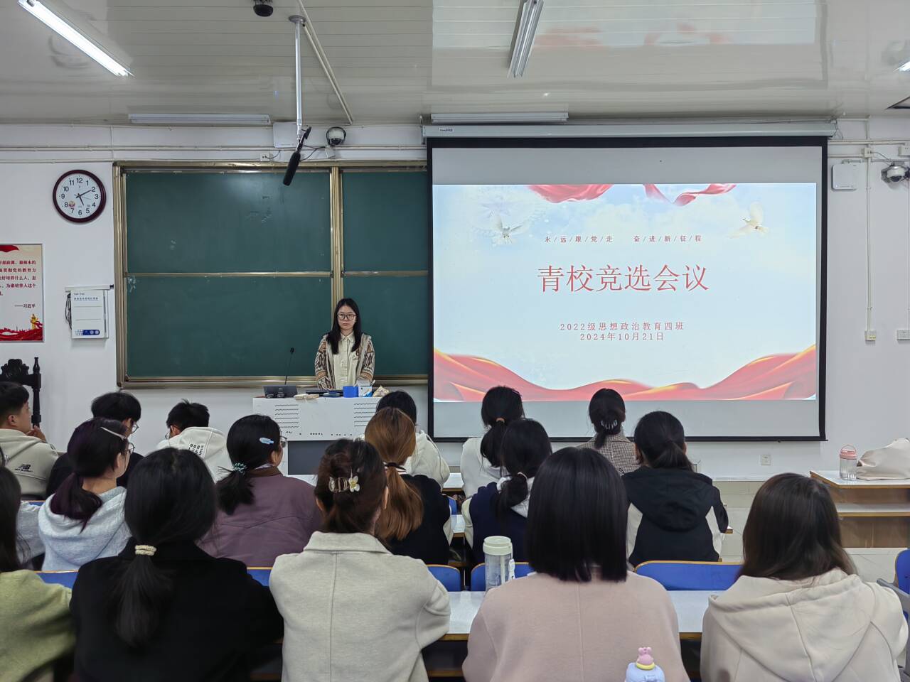 为认真贯彻落实习近平总书记关于青年工作的重要思想,加强对青年政治骨干的培养,10月21日下午,sjb世俱杯网站2022级思想政治教育四班在社科楼514教室组织召开“青校竞选会议”。世俱杯官网2022级思想政治教育四班全体成员参与本次会议。本次会议由团支书牛志杰主持。