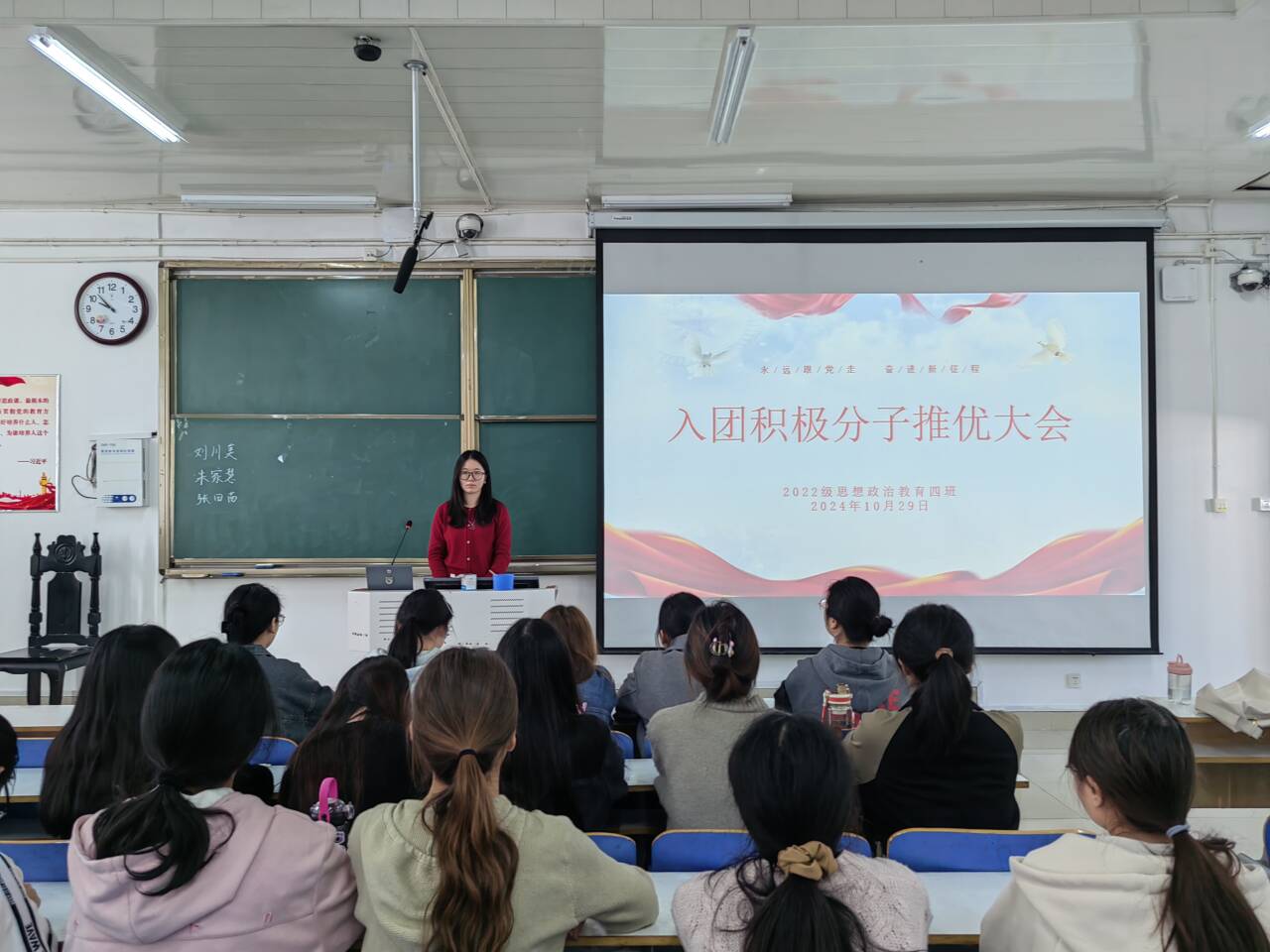 为深入推进全面从严治团,优化团员队伍规模结构,提高发展团员工作质量,10月29日上午,sjb世俱杯网站2022级思想政治教育四班在社科楼514教室组织召开“入团积极分子推优大会”。世俱杯官网2022级思想政治教育四班全体成员参与本次会议。本次会议由团支书牛志杰主持。
