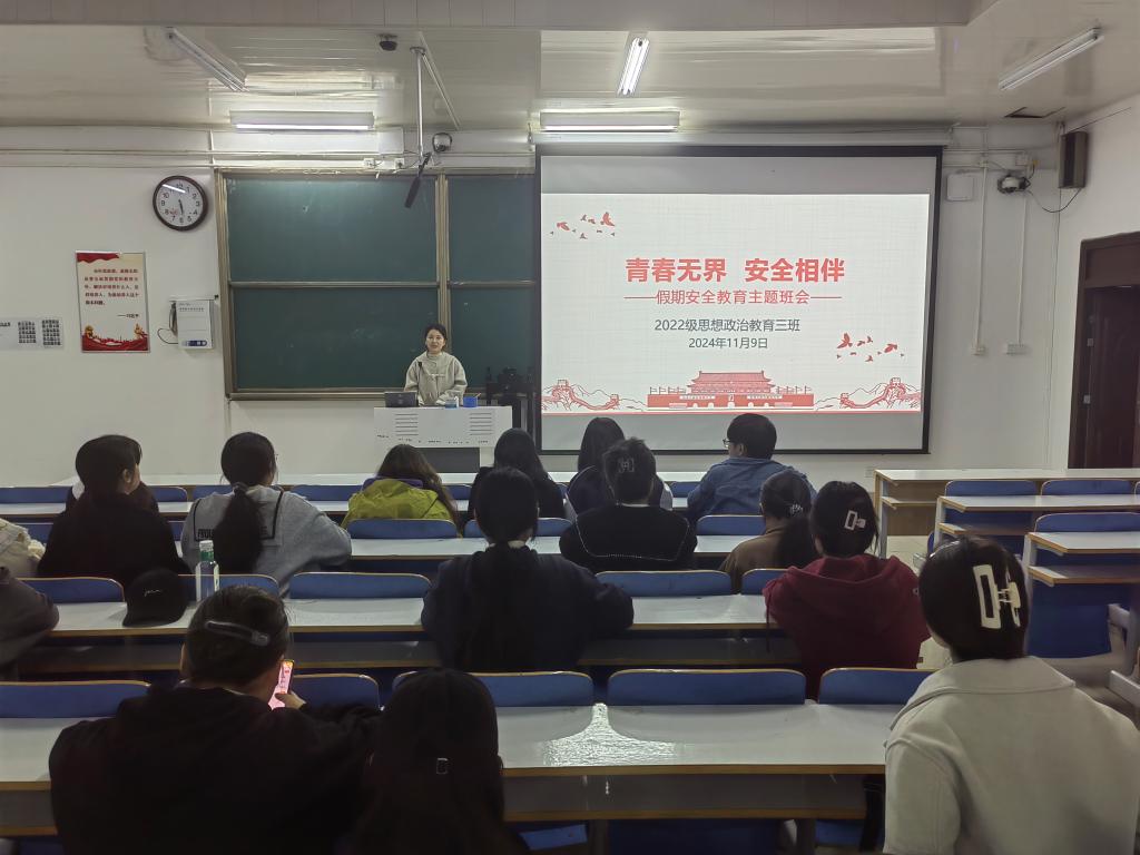 为进一步增强同学们的安全意识,提高防范意识,11月9日下午,sjb世俱杯网站2022级思想政治教育三班在社科楼514教室召开“青春无界,安全相伴”安全教育主题班会。世俱杯官网2022级思想政治教育三班班主任任婷和三班全体成员共同参与此次班会。班会由任婷主持。