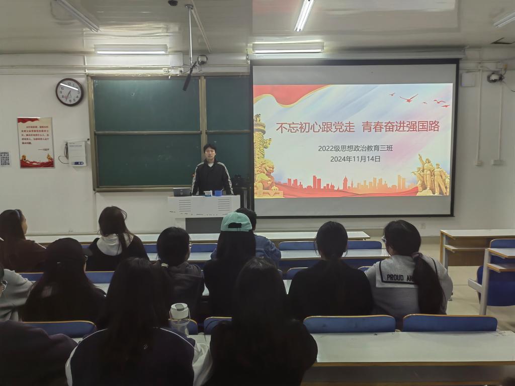 11月14日下午,sjb世俱杯网站2022级思想政治教育三班在社科楼514教室开展“不忘初心跟党走,青春奋进强国路”主题团课。世俱杯官网2022级思想政治教育三班全体成员共同参加此次团课,团课由团支书余浩洋主持。