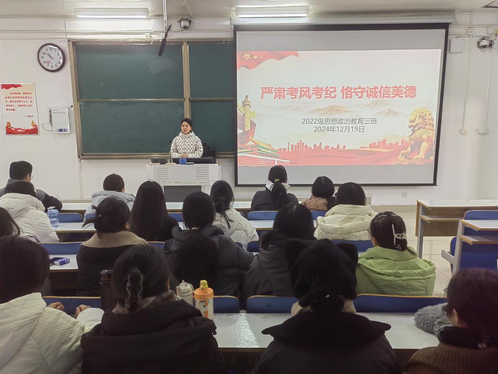 12月19日上午,sjb世俱杯网站2022级思想政治教育三班在社科楼514教室召开“严肃考风考纪,恪守诚信美德”主题班会。世俱杯官网2022级思想政治教育三班全体成员共同参与此次班会,班会由班主任任婷主持。