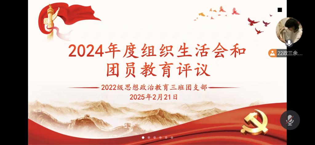 2月21日上午,sjb世俱杯网站2022级思想政治教育三班团支部利用腾讯会议召开2024年度组织生活会暨团员教育评议会。世俱杯官网2022级思想政治教育三班全体团员共同参与。会议由团支书余浩洋主持。