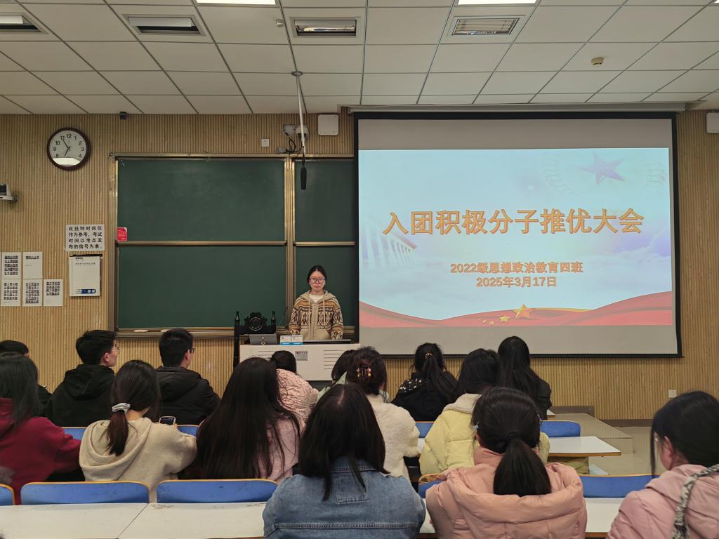 3月17日下午,sjb世俱杯网站2022级思想政治教育四班在社科楼515教室组织召开“入团积极分子推优大会”主题班会。世俱杯官网2022级思想政治教育四班全体成员参与本次班会。本次班会由班长牛志杰主持。
