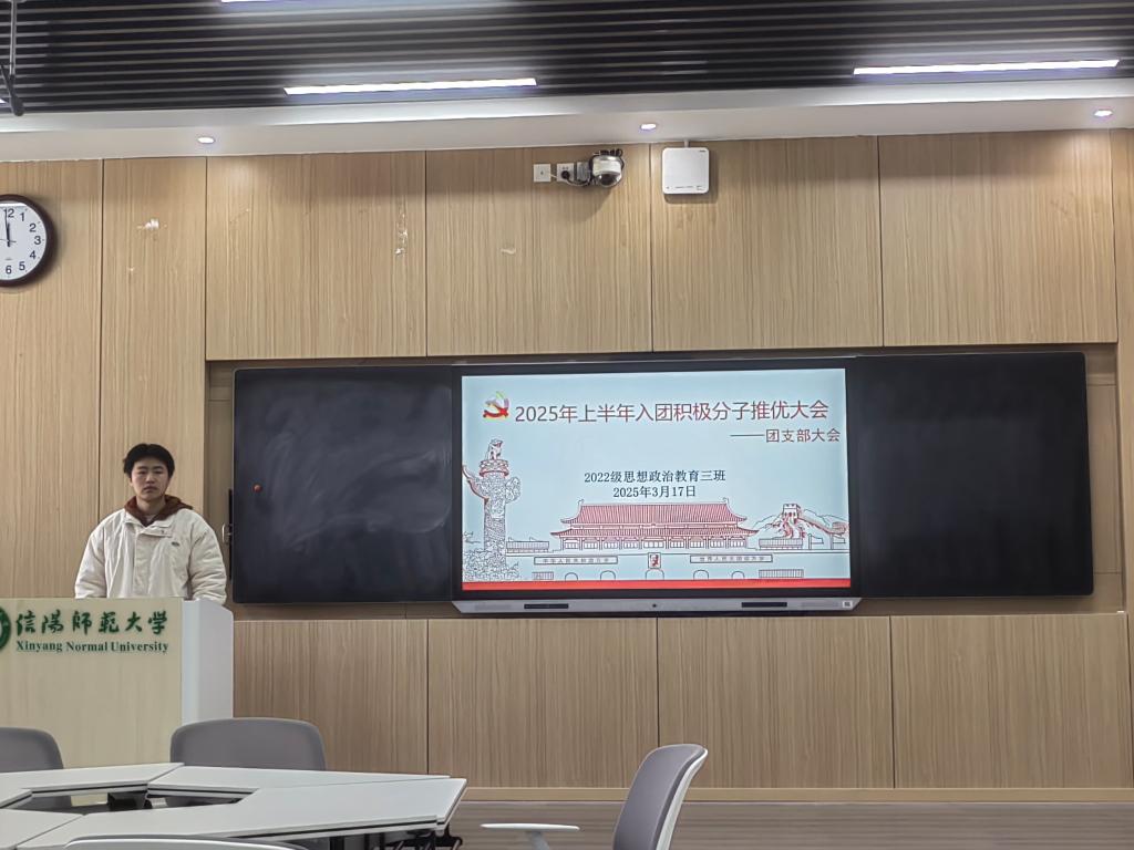3月17日上午,sjb世俱杯网站2022级思想政治教育三班在社科楼516教室召开2025年上半年入团积极分子推优大会。该班班主任任婷与2022级思想政治教育三班全体同学共同参与此次大会。大会由团支书余浩洋主持。