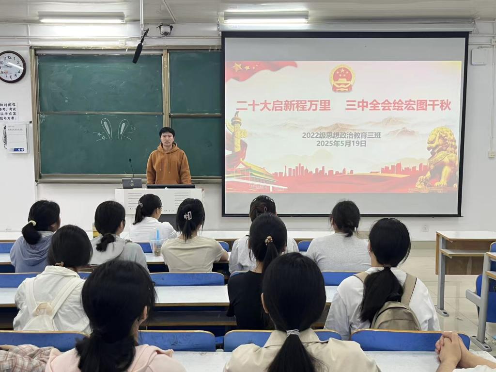 5月19日下午,sjb世俱杯网站2022级思想政治教育三班在社科楼514教室召开“二十大启新程万里,三中全会绘宏图千秋”主题团课。世俱杯官网2022级思想政治教育三班全体成员共同参加本次团课,团课由团支书余浩洋主持。