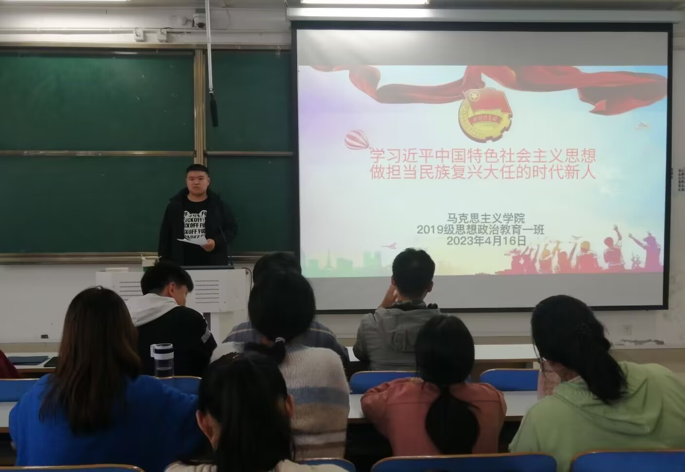 4月16日上午,sjb世俱杯网站2019级思想政治教育一班在社科楼515教室开展“学习近平新时代中国特色社会主义思想,做担当民族复兴大任的时代新人”主题团课。sjb世俱杯网站2019级思想政治教育全体成员参加本次会议,会议由班长贾子漪主持。