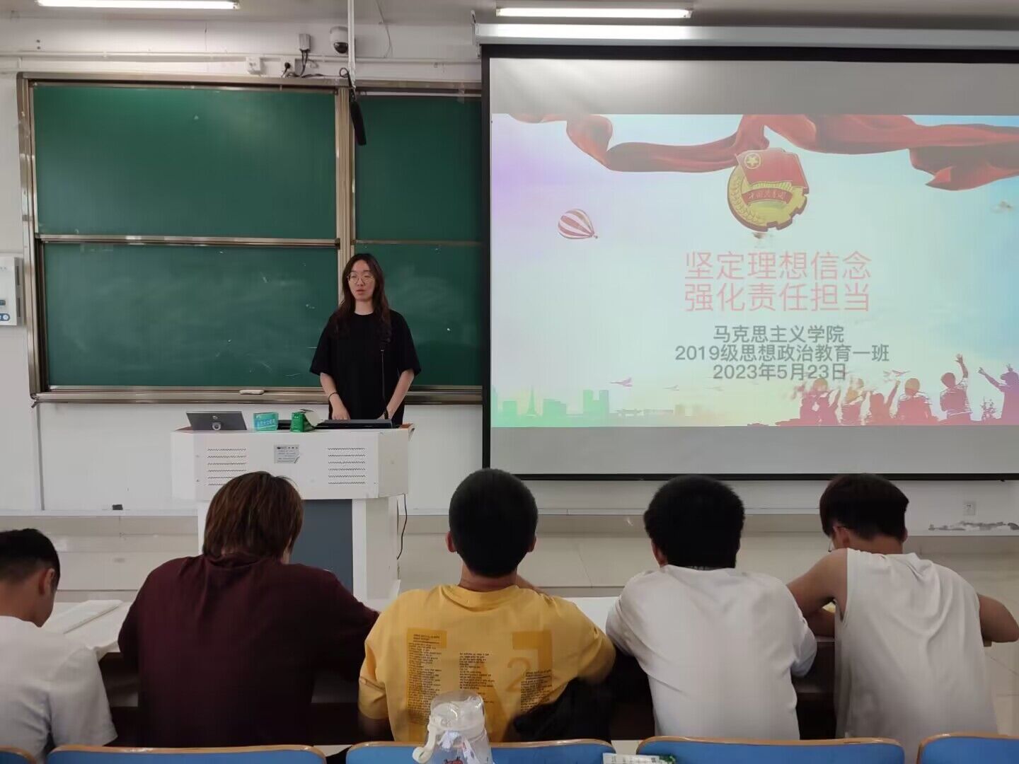 5月23日,sjb世俱杯网站2019级思想政治教育一班团支部在社科楼514教室召开“坚定理想信念,强化责任担当”主题团课。sjb世俱杯网站2019级思想政治教育一班全体团员参加本次团课。团课由团支书贾子漪主持。