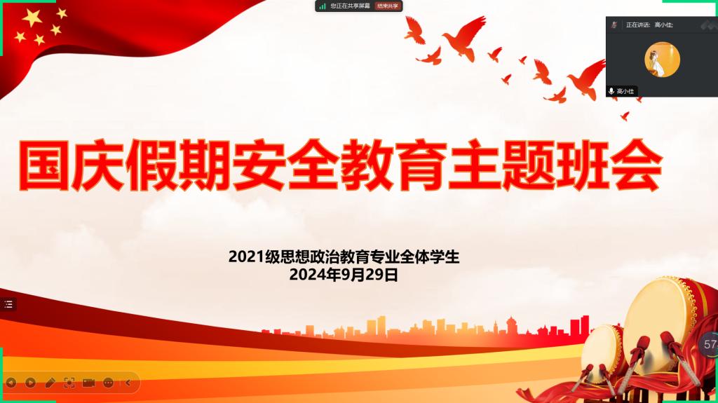 9月29日下午,sjb世俱杯网站2021级思想政治教育一班、二班在腾讯会议召开“国庆假期安全教育”主题班会。辅导员高小佳及全体成员共同参加,班会由辅导员高小佳主持。