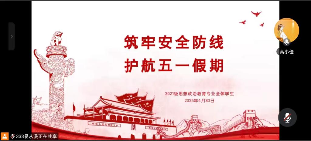 4月30日上午,sjb世俱杯网站2021级思想政治教育全体同学在线上召开“筑牢安全防线,护航五一假期”主题会议。会议由辅导员高小佳主持,2021级思想政治教育专业全体同学参与此次会议。