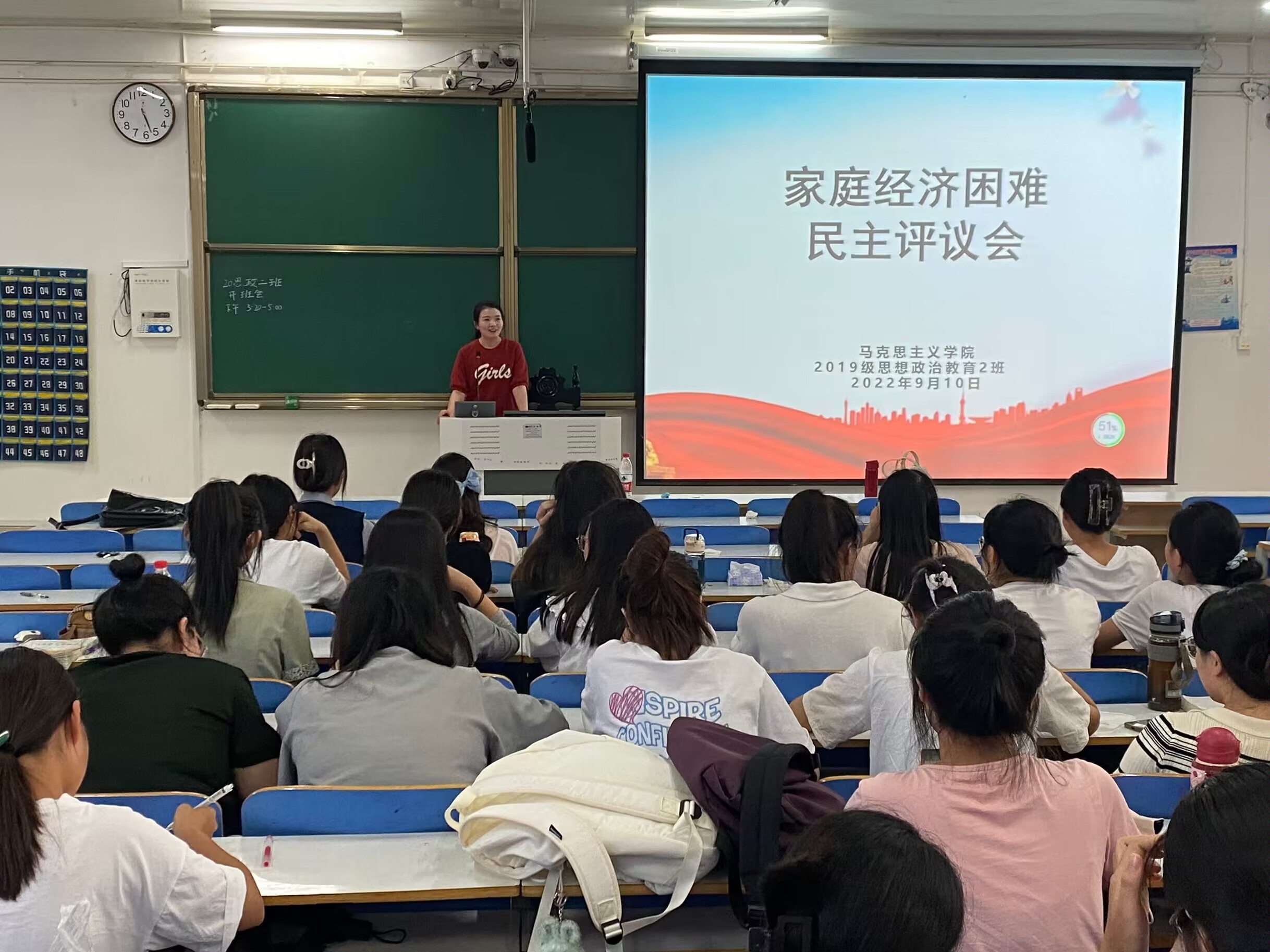 9月10日下午,sjb世俱杯网站2019级思想政治教育二班在社科楼514教室召开2022年班级贫困认定民主评议会。班主任陶青青出席会议,评议小组全体成员按时到会,世俱杯官网权益保障部监督员全程监督。评议会由班长吕昂主持。