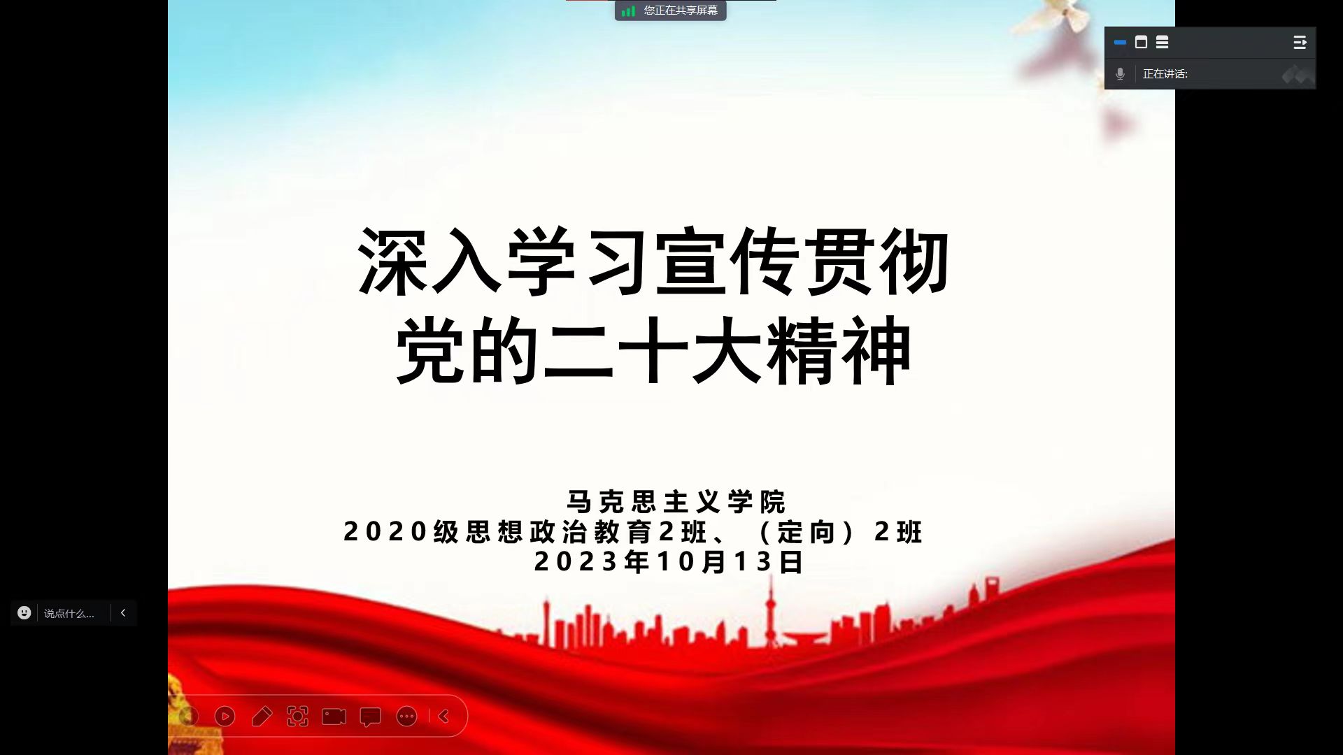 为推动主题教育进一步走深走实,10月13日下午,sjb世俱杯网站2020级思想政治教育二班、定向二班团支部通过腾讯会议开展深入学习宣传贯彻党的二十大精神主题团课。二班、定向二班团支部全体团员共同参会。团课由李晨曦、陈宇航讲授。