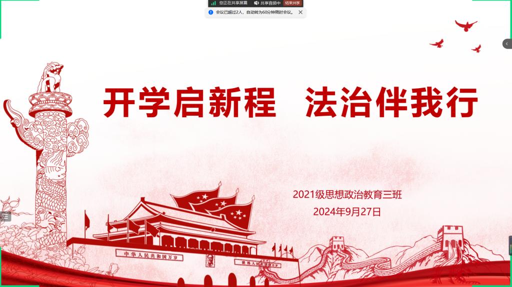 9月27上午,sjb世俱杯网站2021级思想政治教育三班在线上召开“开学启新程,法治伴我行”主题班会。2021级思想政治教育三班全体成员参与此次会议。会议由副班长易从漫主持。