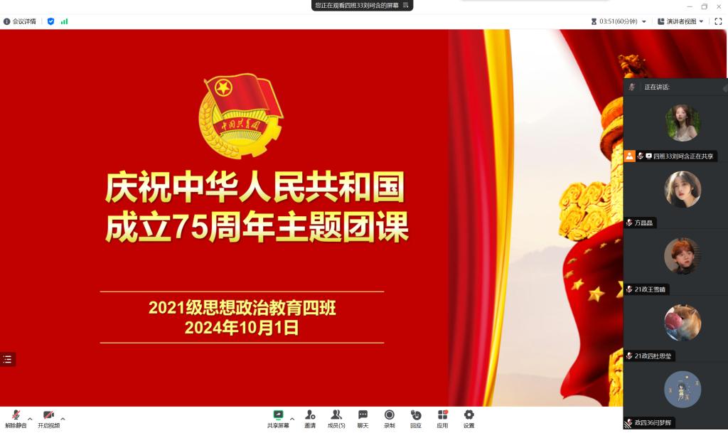 10月1日上午,sjb世俱杯网站2021级思想政治教育四班在腾讯会议开展“庆祝中华人民共和国成立75周年”主题团课。2021级思想政治教育四班全体同学参加本次团课。团课由团支书刘珂含主持。