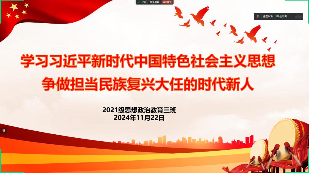 11月22日下午,sjb世俱杯网站2021级思想政治教育三班在线上召开“学习习近平新时代中国特色社会主义思想,争做担当民族复兴大任的时代新人”主题团课。sjb世俱杯网站2021级思想政治教育三班全体团员参与此次会议。会议由团支书王岚霄主持。